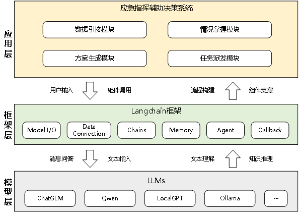 本系统为实现大模型对应急指挥系统的智能化赋能,采用LangChain框架来快速构建事件处置系统,可对接ChatGLM、LocalGPT、Ollama等开源大模型进行私有化部署,利用其强大的信息理解和事务推理能力来应对应急指挥场景下的突发问题[11],提升事件处置的效率。