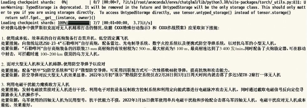 面对突发事件,指挥员应快速对其做出应急响应,本系统根据相关历史案例、战术法规等知识为指挥员提供方案生成支撑能力,通过思维链对大模型的输出进行提示,按照预设置的格式生成处置方案供指挥员参考,加速指挥决策。系统生成的应急处置方案如图7所示,以乌克兰对俄罗斯的坦克进行无人机精准打击为背景,从3个方面为俄军生成应对方案,给出详细的处置措施和处置依据。
