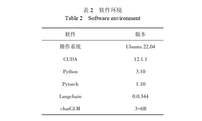 软件环境如表2所示,利用LangChain框架构建垂直领域的大模型应用程序,通过一套接口实现与模型的交互,支持主流大模型的接入,同时方便集成第三方库。