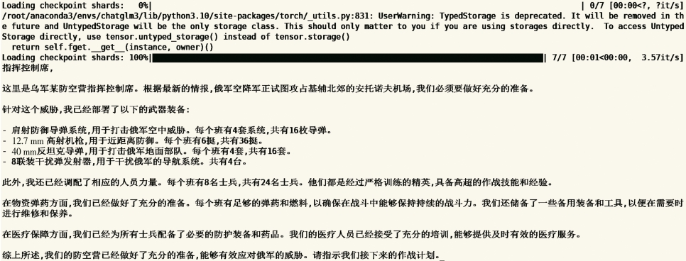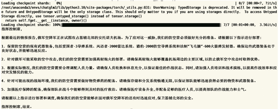 以俄军空降军试图攻占基辅北郊的安托诺夫机场为背景,本系统通过工作流模块自动执行指令派发,将已经形成的应急方案根据指挥席位、层级等信息进行格式化指令生成,利用外挂式知识图谱记忆模块能够自动关联地我方兵力资源,包括装备、弹药以及保障力量等。系统生成的指令报文如图8所示,对防空营指挥控制席位的指挥员进行指令下发,从防空装备的配置、关键目标兵力部署、物资弹药的保障以及医疗救援保障4个方面进行了指示。