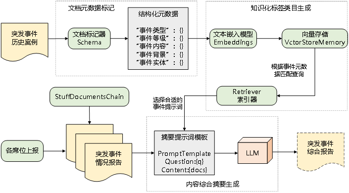 本系统设计的情况掌握模块主要包括文档元数据标记、知识化标签类目生成和内容综合摘要生成3部分,文档元数据标签标记对突发事件的历史案例进行文档标记,支撑构建事件的结构化元数据标签形成应急指挥领域知识化标签类目体系,包括事件类型、事件等级、事件内容、事件背景、事件实体等内容。通过文本嵌入模型存储到向量存储器中。各席位上报的情况报告通过StuffDocumentChain切割成文件块,通过索引器根据事件元数据从向量数据库中查询相关信息,并填入到对应的摘要提示词模板中,最终输入到大模型进行多个情况报告的内容综合摘要生成。