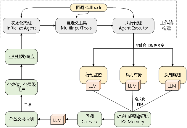 本系统依靠LangChain提供的回调机制实现对任务执行的方法和时机进行预设,自定义工具可设置任务执行的具体内容,执行代理可设置任务执行的条件,系统能够按照业务逻辑将多个任务进行串联有序执行形成完整的工作流。当突发事件处置进入方案实施阶段,用户触发任务派发动作,系统将按照处置方案中处置步骤将任务加入工作流,非结构化的处置方案通过大模型翻译转换成格式化指挥命令,其内容包括命令发送方、命令接收方、命令类型、命令内容、紧急程度等要素。系统通过对话知识图谱记忆组件完成事件实体和实体间关联关系的图谱构建,完成格式化指挥命令各类要素内容的填写。系统监听到指挥命令生成完毕后,通过回调机制调用预设接口完成作战文书拟制,最终由指挥员人工核查、修改、发送,实现人在回路的任务工单派发。