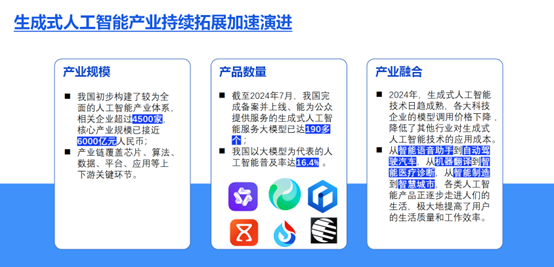 《报告》展现了当前我国生成式人工智能相关产业的发展全景。一是高标准产业初步形成。截至目前,我国初步构建了较为全面的人工智能产业体系,相关企业超过4500家,核心产业规模已接近6000亿元人民币,产业链覆盖芯片、算法、数据、平台、应用等上下游关键环节。生成式人工智能的蓬勃发展和加速迭代,已经在研发设计、生产制造等领域崭露头角,成为新型工业化的重要推动力。二是高水平产品加速演进。以大模型为代表的人工智能产品正在以一日千里的速度加速演进。截至2024年7月,我国完成备案并上线、能为公众提供服务的生成式人工智能服务大模型已达190多个,为用户提供了丰富的选择空间和差异化体验。从文本生成、图像生成到数字人、视频剪辑等,生成式人工智能产品已逐渐成为人们日常生活的一部分,像普通软件一样融入工作和生活。三是高质量用户快速发展。截至2024年6月,我国已有2.3亿人使用过生成式人工智能产品,占整体人口的16.4%。其中,生成式人工智能产品在中青年、高学历网民中的使用率最高。同时,有40.6%的未成年网民表示对人工智能技术很感兴趣,越来越多的未成年人开始关注人工智能。