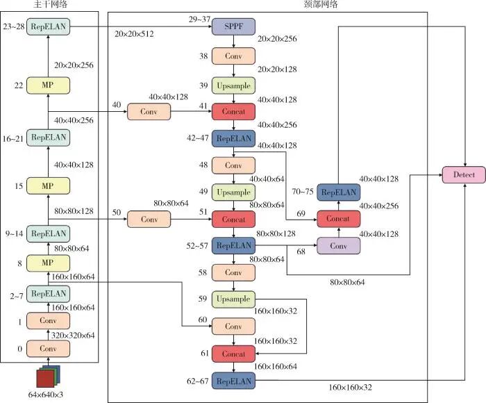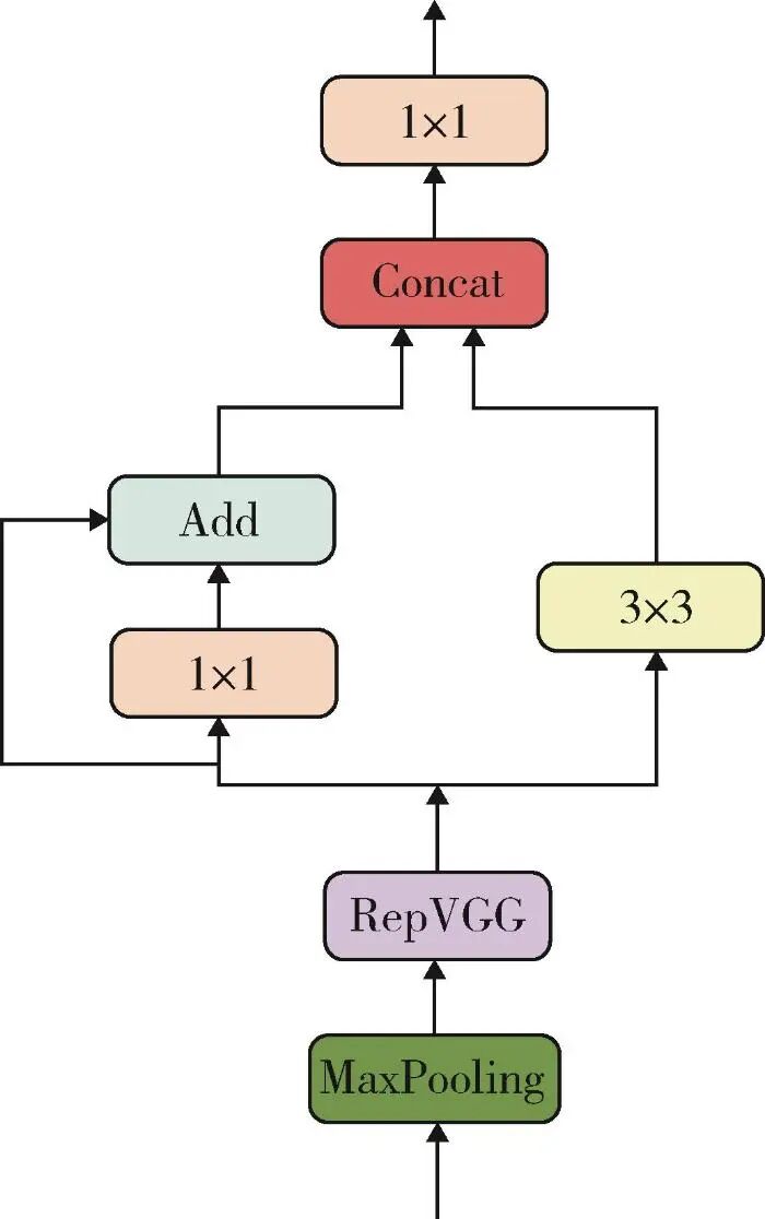本文提出了RepELAN架构,重新设计了YOLOv7-Tiny的主干网络部分中的ELAN结构,具体结构如图3所示。RepELAN采用最大值池化进行下采样,使用RepVGG卷积进行进一步的特征学习。通过将RepVGG的输出分别输入到1×1卷积和3×3卷积中,并进行拼接,获得不同程度感受野(在输入图像上,一个神经元可以看到或响应的区域大小)和不同层次的特征信息,以提高检测精度。在最后的输出中添加原始输入,并通过1×1卷积进行通道信息的学习和提取更高级的特征和语义信息,以提升网络精度并避免梯度消失现象。
