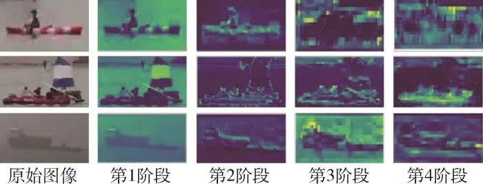 为了清晰地展示本文所提出的RepELAN模型主干网络在进行特征提取时的工作原理,如图10所示,将整个特征提取过程划分为4个阶段,并且对各阶段生成的特征图进行可视化操作,便于分析神经网络所提取到的特征性质。根据图10所示的可视化结果,可以得出以下结论:在RepELAN模型主干网络的特征提取过程中,卷积层在第1阶段提取了浅层特征信息,这些特征信息能够帮助模型有效地分割出海上目标船舶所在的前景区域和背景区域。在第2阶段,经过卷积操作后的特征图的下采样效果明显增强,这意味着特征图中的细节信息被进一步压缩,但是仍然能够保留有用的特征信息。在后2个阶段特征图则获得了更加抽象的全局空间信息,但高层语义信息已经变得模糊,这表明特征图中的特征已经变得更加抽象化,但是仍然具有区分不同物体的能力。同时,由于下采样操作,海上目标船舶的形状也开始变得抽象。总的来说,这些结果表明RepELAN主干网络模型能够有效地提取海洋背景下目标船舶图像中的纹理、形状和边缘等特征信息,从而为海上目标船舶的检测提供了有力的支持。