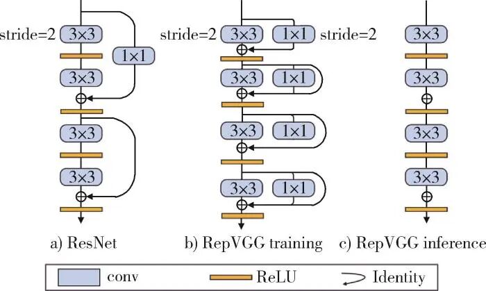 RepVGG[21]模块是一种由3×3卷积和ReLU激活函数构成的简单体系结构,在GPU和专用硬件上以极快的速度进行。该模块受ResNet的启发,应用了结构重参数化方法,具体过程如图2所示。在训练期间,RepVGG模块将一个模块拆分为多个相同或不同的模块分支,并在推理期间将多个分支模块集成为完全等效的模块。类似于ResNet,该模块通过残差方式学习f,将信息流建模为y=x+f(x)。当x与f(x)的通道数不匹配时,使用一个1×1卷积来调整通道数,得到y=g(x)+f(x),其中g(x)为1×1卷积。在训练阶段,RepVGG简单地堆叠这些卷积块来构建训练模块。而在推理阶段,通过重参数化方法,RepVGG将训练好的卷积块转换为单个3×3卷积进行推理。该模块能够在硬件上实现高效的推理,并保持较好的多尺度特征融合能力。
