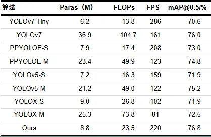 将所提出的方法与最先进的物体检测器进行比较,结果如表3所示。从表3中的结果中可以看出,本文所提出的方法(Ours)在速度和准确度的平衡方面综合表现最佳。具体来说,如果将所提出的方法与YOLOv7-Tiny进行比较,本文方法在FPS方面虽然低66帧,但仍然可以远超其他算法,而准确度相比于YOLOv7-Tiny(mAP@0.5)高6.2%。此外,YOLOv7在161 fps的帧速率下具有76.0%的mAP@0.5,而本文算法在具有相似准确率的同时速率方面大大超越YOLOv7达到了220 fps,且所用参数量比YOLOv7少了83.19%。如果将具有220 fps推理速度的本文方法与具有159 fps推理速度的YOLOv5-S进行比较,本文所提出的方法可以提高4.9%的mAP@0.5。如果将所提出的方法与相似参数规模的YOLOX-S进行比较,则所提出的方法的推断速度比YOLOX-S快118帧,同时mAP@0.5比YOLO-S高4.9%。此外,就参数和计算量而言,与YOLOv5-M相比,所提出的方法减少了75.49%的参数量和25.5(FLOPs)的计算量,但mAP@0.5提高了1.6%。总体而言,本文所提出的方法在速度、准确度以及参数和计算量的平衡方面表现出色,优于其他列举的目标检测算法。