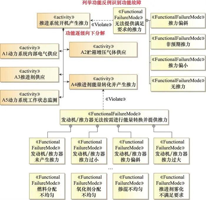 功能故障识别与系统的功能分解同步开展, 针对活动图、状态机图、时序图中所确定的系统功能, 通过列举功能对需求实现的不同程度识别功能故障, 包括功能丧失、部分功能丧失、功能退化、功能过度、功能间断、功能延期、非预期功能等。如图 5所示, 针对“推进系统开机产生推力”这一功能, 通过列举其反例识别出包括“推力偏斜”“非预期推力”“推力偏小”“无推力”等功能故障模式。然后, 对于功能分解得到的分系统功能, 可仍采用列举反例的方法识别出潜在的功能故障, 直至识别出最小功能单元的功能故障。
