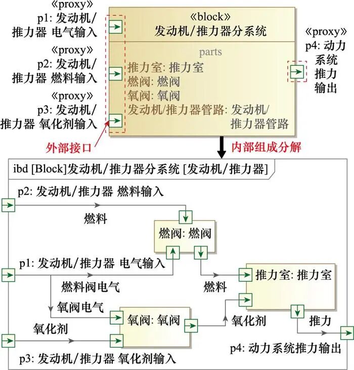 步骤2 根据对“推进剂能量转化并产生推力”这一功能的分解确定发动机/推力器分系统的结构组成及内部组件间的传递关系, 并利用内部模块图定义建立各组件, 包括燃阀、氧阀、推力室等。