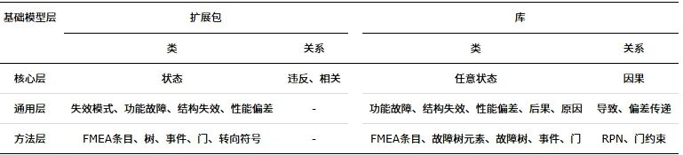 核心层作为通用层和方法层的基础, 对故障建模和可靠性分析中的通用概念的元素和关系进行定义, 如扩展包中的“状态”, “违反”关系、“相关”关系等。