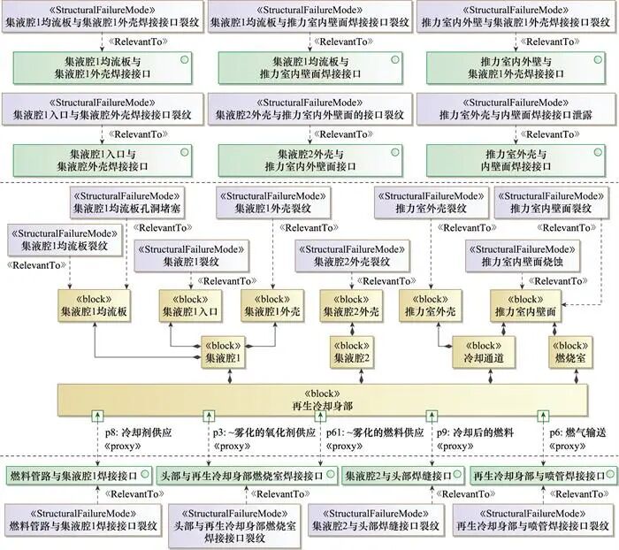 如图 10所示, 以推力室中的再生冷却身部为例, 利用基于失效物理的有限元仿真分析, 确定其最小零件(如推力室内壁)的结构失效模式, 包括“裂纹”“烧蚀”等。通过结构模型建模确定推力室内壁面与推力室外壳之间采用焊接形式进行连接, 可确定该接口可能的结构失效形式, 包括“推力室外壳与内壁面焊接接口泄漏”的结构失效。采用“结构失效”这一构造型对上述结构失效进行描述, 并采用“相关”关系描述结构失效的位置。针对再生冷却身部, 形成如图 11所示的结构失效模式建模。