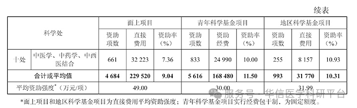 2024年度医学科学部共接收面上项目申请51798项,比2023年度增加16789项,增幅为47.96%。资助4684项,平均资助率为9.04%,直接费用平均资助强度为49.00 万元/项。2024年度医学科学部共接收青年科学基金项目申请48854项,比2023年度增加4601项,增幅为10.40%。资助5616项,平均资助率为11.50%,平均资助强度为30.00万元/项。2024年度医学科学部共接收地区科学基金项目申请9633项,比2023年度增加876项,增幅为10.00%。资助993项,平均资助率为10.31%,直接费用平均资助强度为 31.99 万元/项。注意事项: