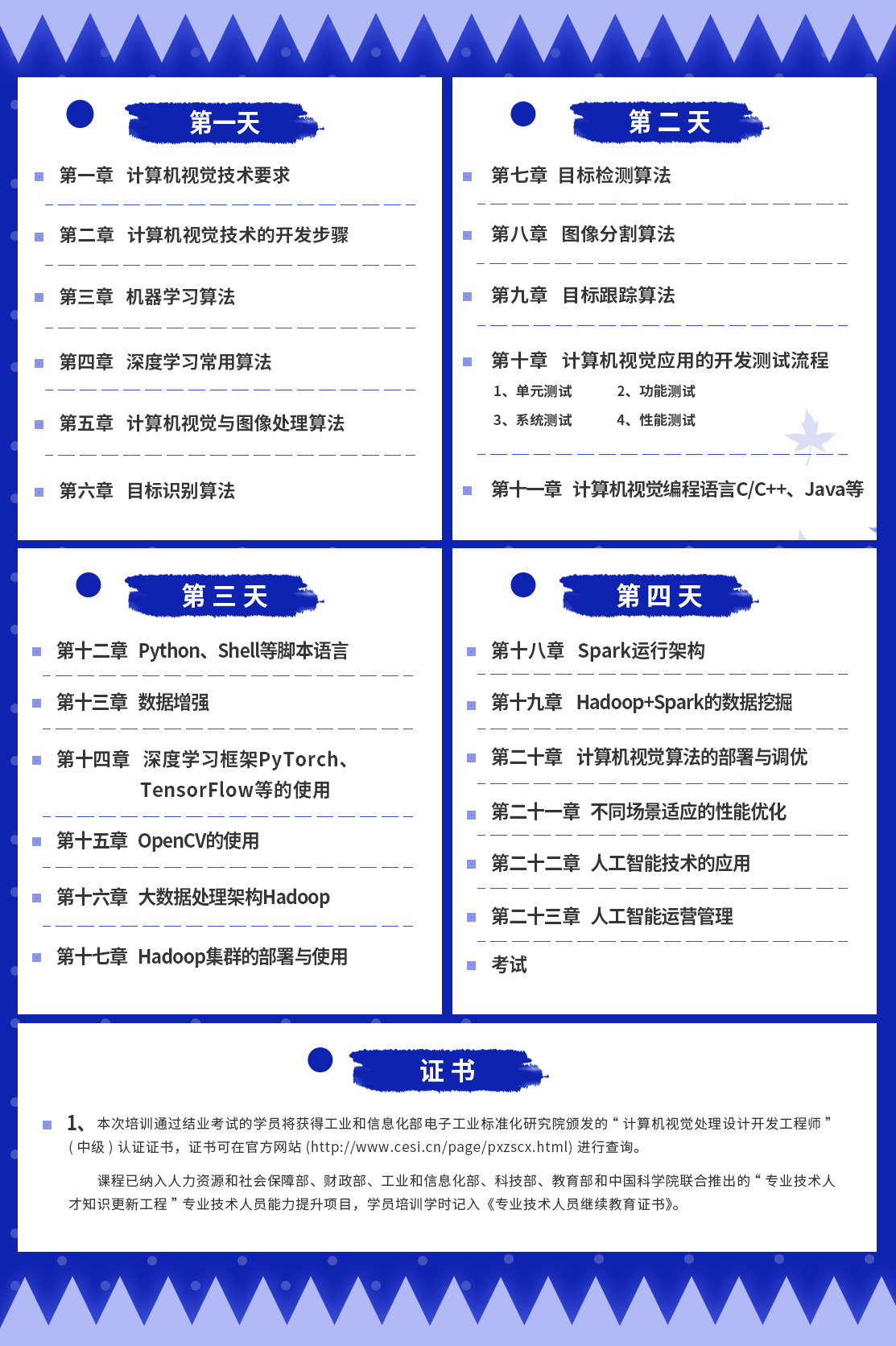 培训课程体系围绕我国人工智能产业生态,以SJ/T11805-2022《人工智能从业人员能力要求》电子行业标准为依据,结合工程实践案例,对计算机视觉、自然语言及语音处理、人工智能应用集成等职业方向展开授课,培养符合标准知识、技能要求的人工智能人才。